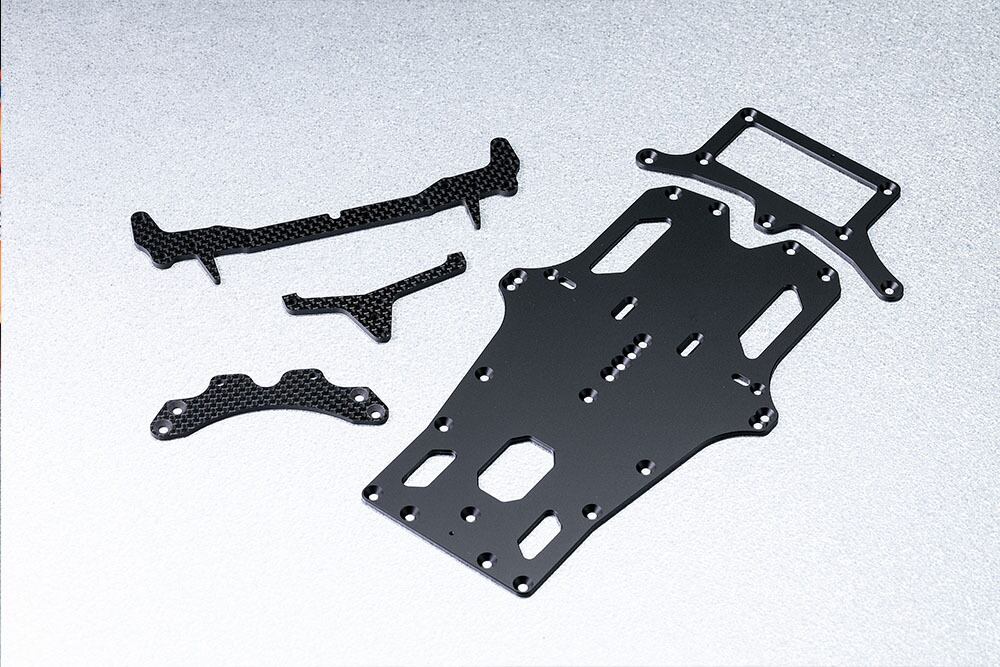 日々、ハイスピード化の進む12分の1レーシングカーシーンに対応すべくシャシー各部をリニューアル。まずメインシャシーは、より幅広い路面コンディションに対応するべくデザインを見直し、これに高品質&高剛性が自慢のヨーロッパ製の2.0㎜厚70-75ジュラルミン材を組み合わせ低重心と最適なシャシーロールを実現しました。