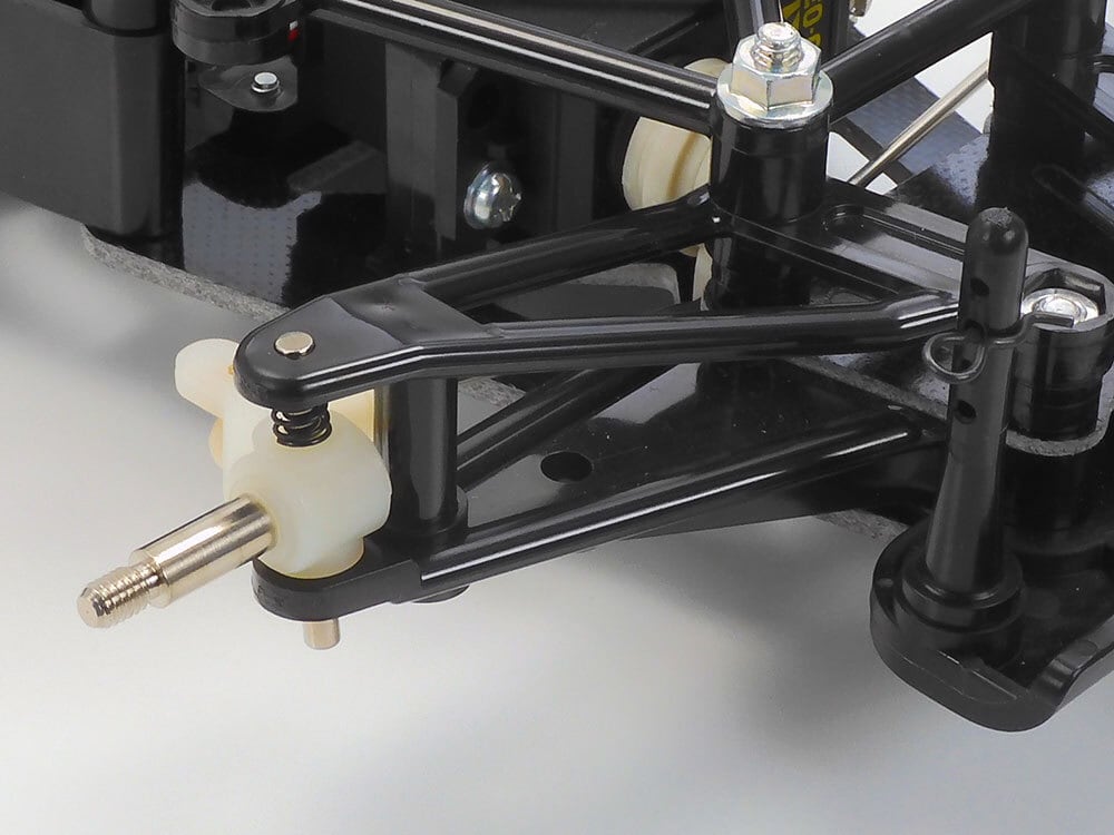 【 基本スペック 】 ●全長483mm、全幅207mm、全高108mm ●ホイールベース270mm ●タイヤ幅/径=前28/64mm 後45/68mm ●フレーム=バスタブタイプをメインに、前後にスペースフレームを、下面にFRPプレートを組み合わせたコンポジットタイプ ●駆動方式=横置きモーター・ダイレクトドライブ2WD ●デフギヤ=ボールデフ ●ステアリング=2分割タイロッド式 ●サスペンション=フロントはキングピン・コイルスプリング独立、リヤは1.5mm厚のFRP製TバーをCVAオイルダンパーで制御する3Pタイプ ●ギヤ比=キット標準(14T)5.00:1 (別売のピニオンと組み合わせて4.38:1~5.83:1までの5種類のギヤ比が選択可能) ●モーター=540タイプ ●スピードコントローラー=ESC仕様 (別売)